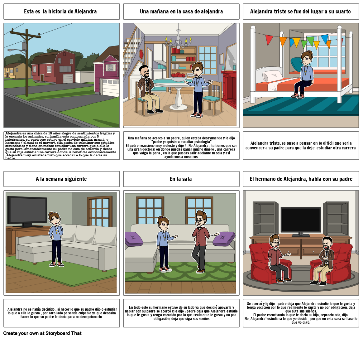 Se acercó y le dijo : padre deja que Alejandra estudie lo que le gusta y tenga vocación por lo que realmente le gusta y no por obligación, deja que siga sus sueños.El padre escuchando lo que le decía su hijo, reprochando, dijo:No, Alejandra! estudiara lo que yo decida , porque en esta casa se hace lo que yo digo.