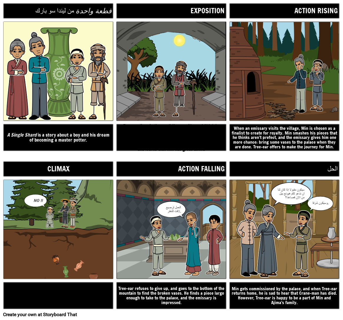 Along his journey to Songdo, Tree-ear is robbed. The robbers take Min’s beautiful vases and throw them off of a high cliff, shattering them to pieces.