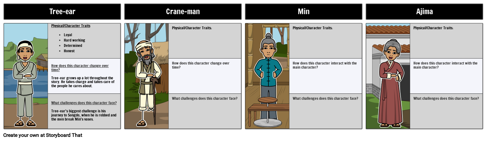 Physical/Character TraitsLoyalHard workingDeterminedHonest How does this character change over time?Tree-ear grows up a lot throughout the story. He takes charge and takes care of the people he cares about. What challenges does this character face?Tree-ear's biggest challenge is his journey to Songdo, when he is robbed and the men break Min's vases.