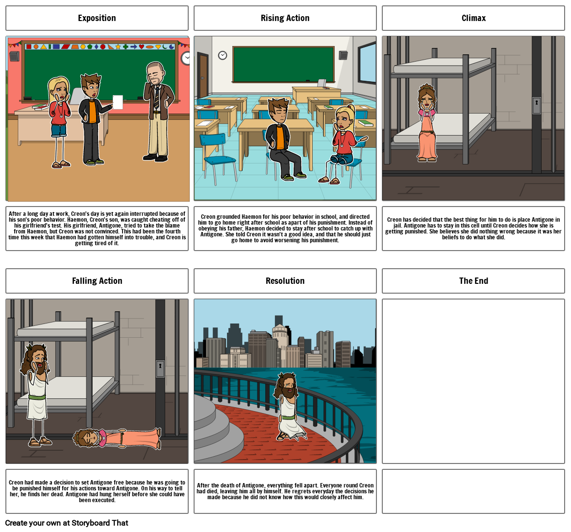 After a long day at work, Creon's day is yet again interrupted because of his son's poor behavior. Haemon, Creon's son, was caught cheating off of his girlfriend's test. His girlfriend, Antigone, tried to take the blame from Haemon, but Creon was not convinced. This had been the fourth time this week that Haemon had gotten himself into trouble, and Creon is getting tired of it.