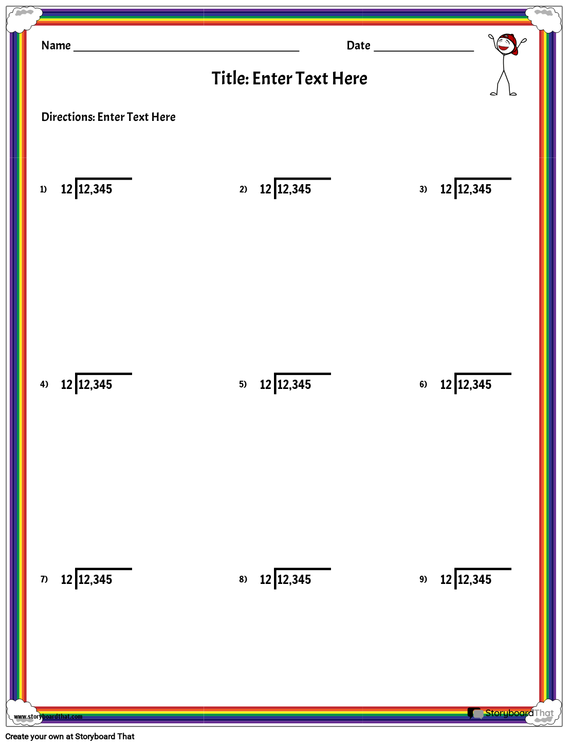Персонализируеми работни листове за разделяне от Storyboard That. Портретно оформление в цвят. Многоцифрено деление.