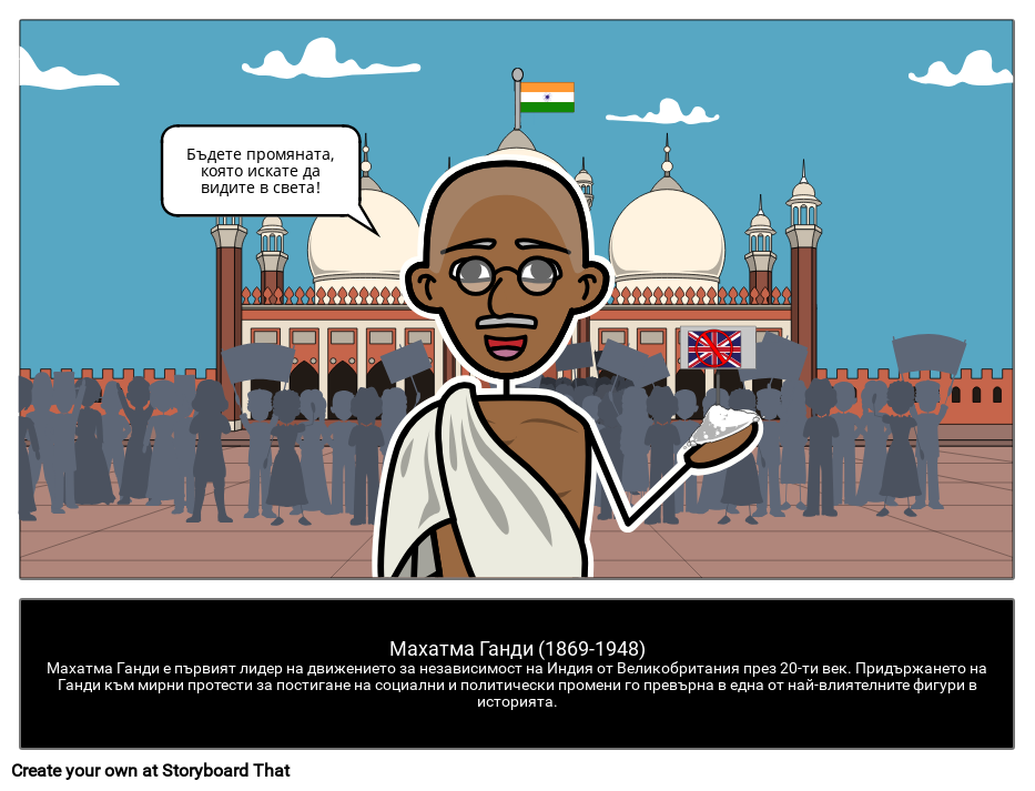 Махатма Ганди (1869-1948)Махатма Ганди е първият лидер на движението за независимост на Индия от Великобритания през 20-ти век. Придържането на Ганди към мирни протести за постигане на социални и политически промени го превърна в една от най-влиятелните фигури в историята.
