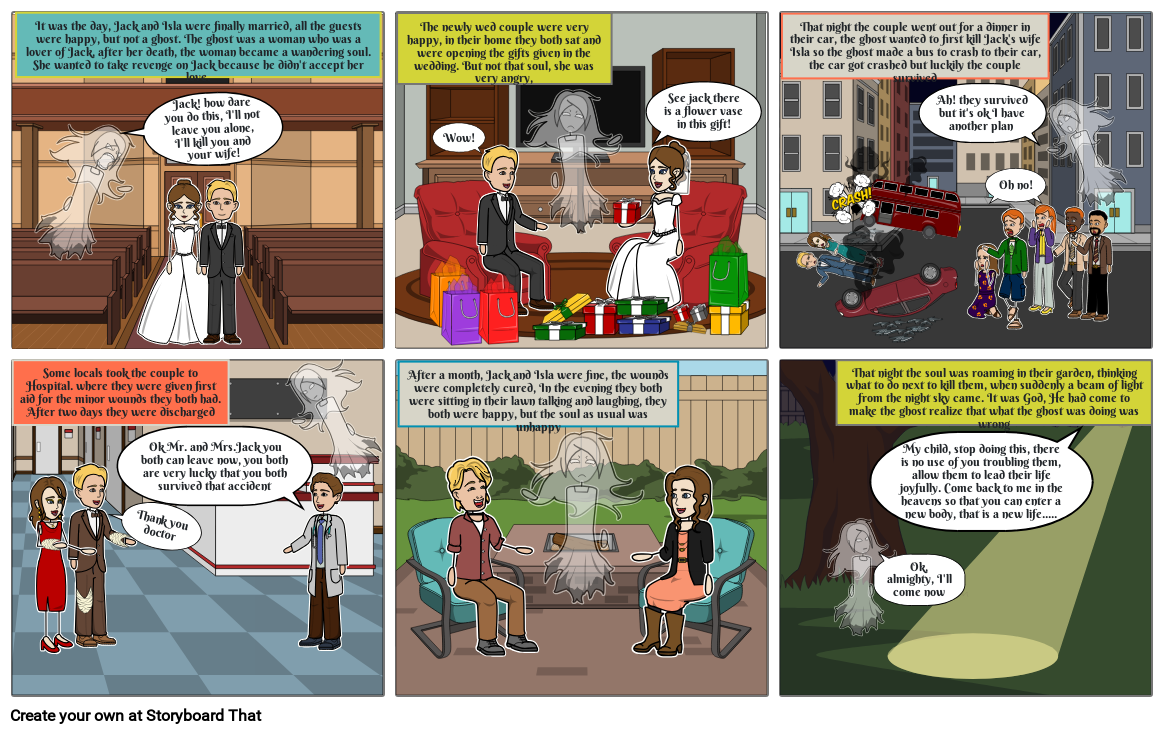 It was the day, Jack and Isla were finally married, all the guests were happy, but not a ghost. The ghost was a woman who was a lover of Jack, after her death, the woman became a wandering soul. She wanted to take revenge on Jack because he didn't accept her love.