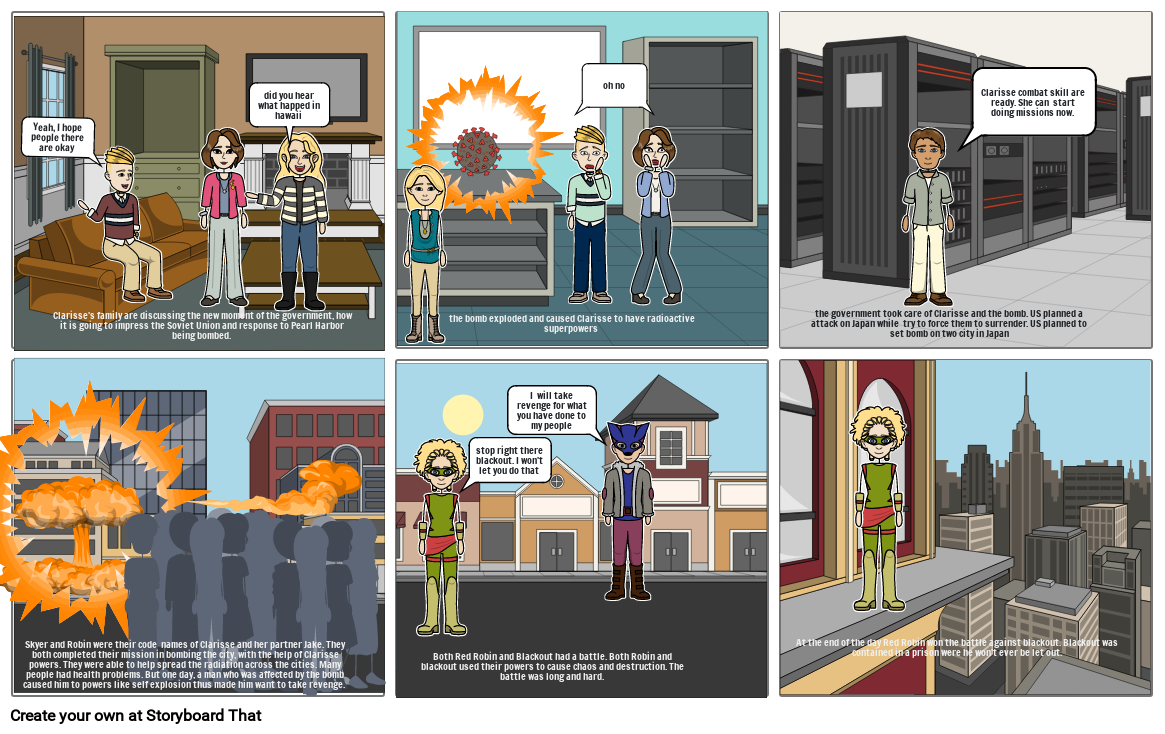 Skyer and Robin were their code names of Clarisse and her partner Jake. They both completed their mission in bombing the city, with the help of Clarisse powers. They were able to help spread the radiation across the cities. Many people had health problems. But one day, a man who was affected by the bomb caused him to powers like self explosion thus made him want to take revenge.