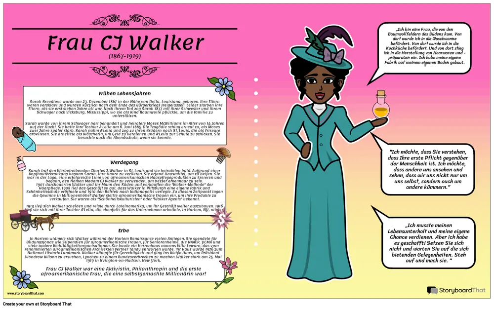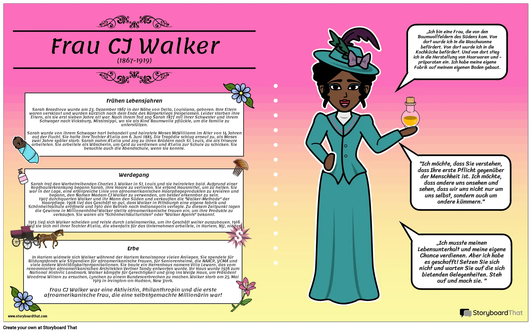 Werdegang Sarah traf den Werbetreibenden Charles J. Walker in St. Louis und sie heirateten bald. Aufgrund einer Kopfhauterkrankung begann Sarah, ihre Haare zu verlieren. Sie erfand Hausmittel, um zu helfen. Sie war in der Lage, eine erfolgreiche Linie von afroamerikanischen Haarpflegeprodukten zu kreieren und begann, den Namen Madam CJ Walker zu verwenden, um besser erkennbar zu sein. 1907 durchquerten Walker und ihr Mann den Süden und verkauften die "Walker-Methode" der Haarpflege. 1908 lief das Geschäft so gut, dass Walker in Pittsburgh eine eigene Fabrik und Schönheitsschule eröffnete und 1910 den Betrieb nach Indianapolis verlegte. Zu diesem Zeitpunkt lagen die Gewinne in Millionenhöhe! Walker stellte afroamerikanische Frauen ein, um ihre Produkte zu verkaufen. Sie waren als "Schönheitskulturisten" oder "Walker Agents" bekannt. 1913 ließ sich Walker scheiden und reiste durch Lateinamerika, um ihr Geschäft weiter auszubauen. 1916 ließ sie sich mit ihrer Tochter A'Lelia, die ebenfalls für das Unternehmen arbeitete, in Harlem, NY, nieder.