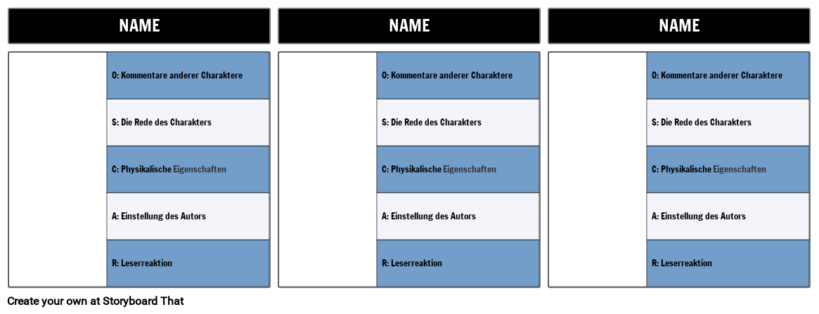 O: Kommentare anderer Charaktere S: Die Rede des Charakters C: Physikalische Eigenschaften A: Einstellung des Autors R: Leserreaktion