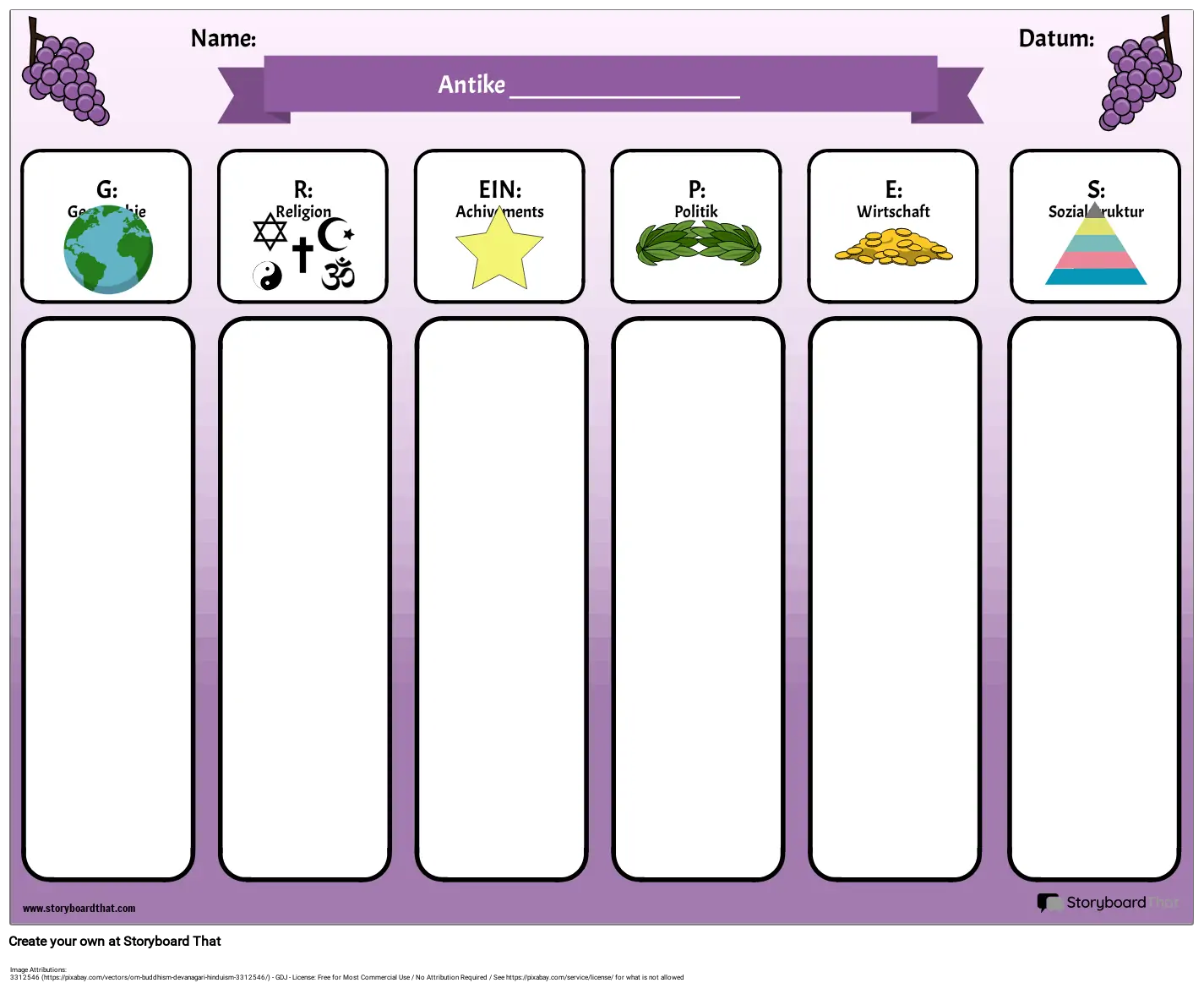 Antike Zivilisationen werden in der Regel mit Schwerpunkt auf den folgenden Schlüsselbereichen gelehrt: Geographie, Religion, Errungenschaften, Politik, Wirtschaft und Sozialstruktur unter Verwendung des Akronyms GRAPES Durch die Verwendung dieses Akronyms können die Schüler ihre Erkenntnisse unterteilen und verschiedene Zivilisationen vergleichen und einander gegenüberstellen.