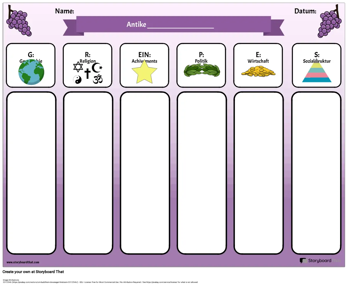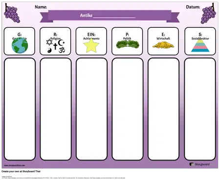 Das Akronym GRAPES ist ein hilfreiches Werkzeug, wenn Sie sich mit alten Zivilisationen oder verschiedenen Ländern befassen. Verwenden Sie dieses TRAUBEN-Diagramm digital (lassen Sie die Schüler ihre Notizen eingeben und Bilder zu jeder Kategorie hinzufügen) oder drucken Sie es aus, damit die Schüler ihre Notizen handschriftlich schreiben können.