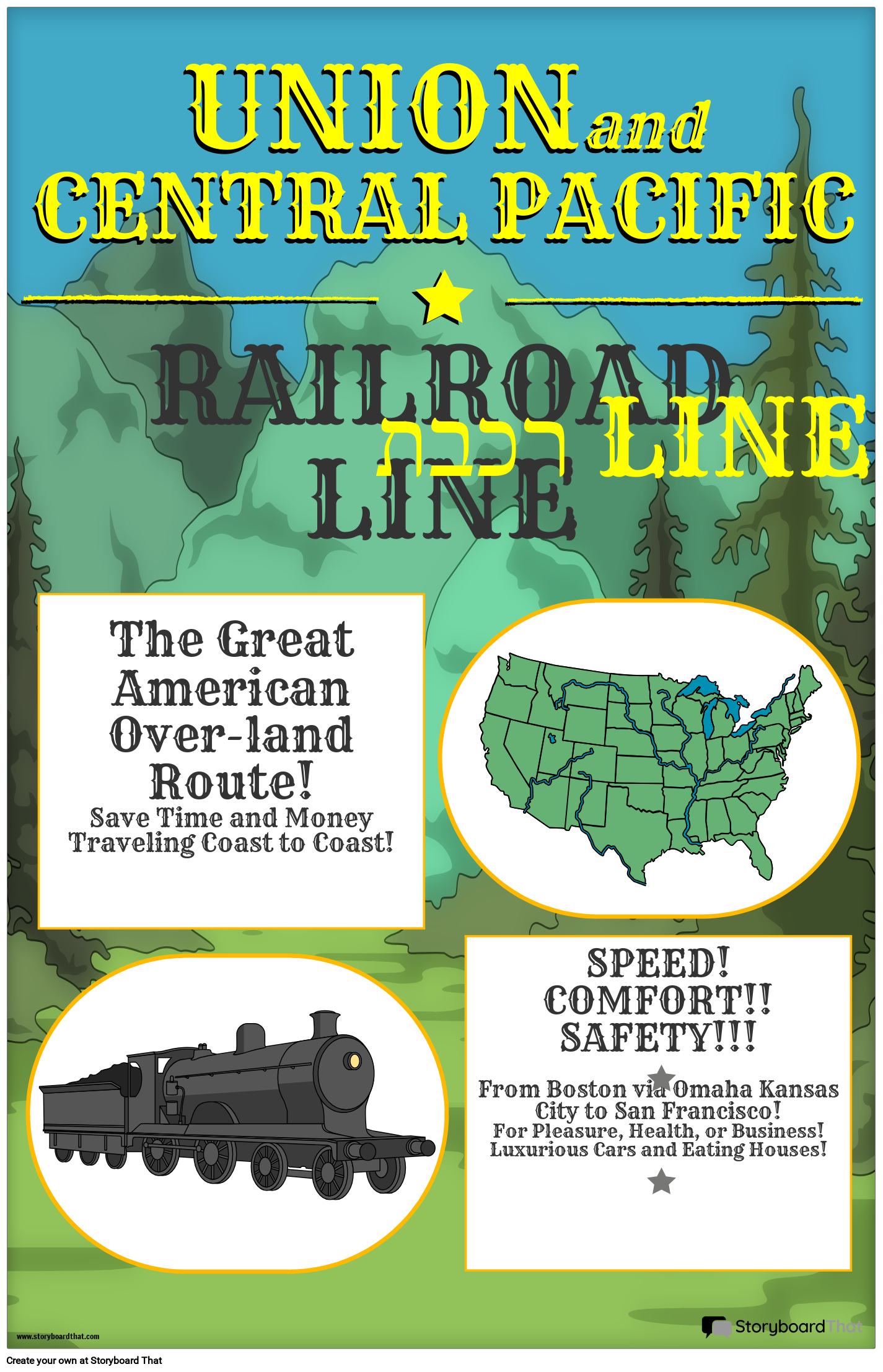 SPEED!COMFORT!!SAFETY!!!From Boston via Omaha Kansas City to San Francisco!For Pleasure, Health, or Business! Luxurious Cars and Eating Houses!