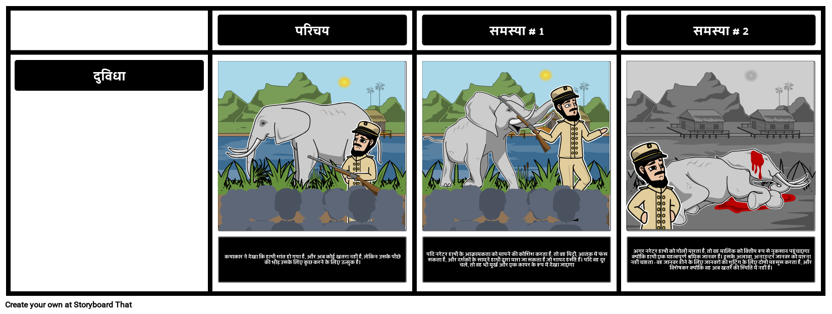 अगर नरेटर हाथी को गोली मारता है, तो वह मालिक को वित्तीय रूप से नुकसान पहुंचाएगा क्योंकि हाथी एक महत्वपूर्ण श्रमिक जानवर है। इसके अलावा, अनाउन्टर जानवर को मारना नहीं चाहता - वह जानवर होने के लिए जानवरों की शूटिंग के लिए दोषी महसूस करता है, और विशेषकर क्योंकि वह अब खतरे की स्थिति में नहीं है।