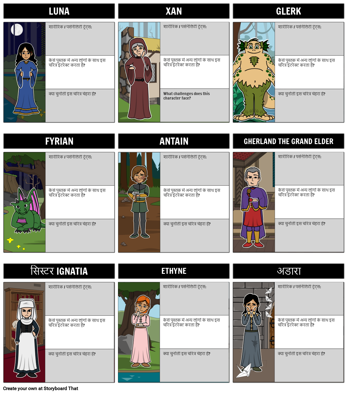 छात्र एक पुस्तक के पात्रों को प्लॉट कर सकते हैं और प्रत्येक चरित्र के बारे में लिख सकते हैं शारीरिक / व्यक्तित्व लक्षण, दूसरों के साथ उनकी बातचीत और उनके सामने आने वाली चुनौतियाँ।