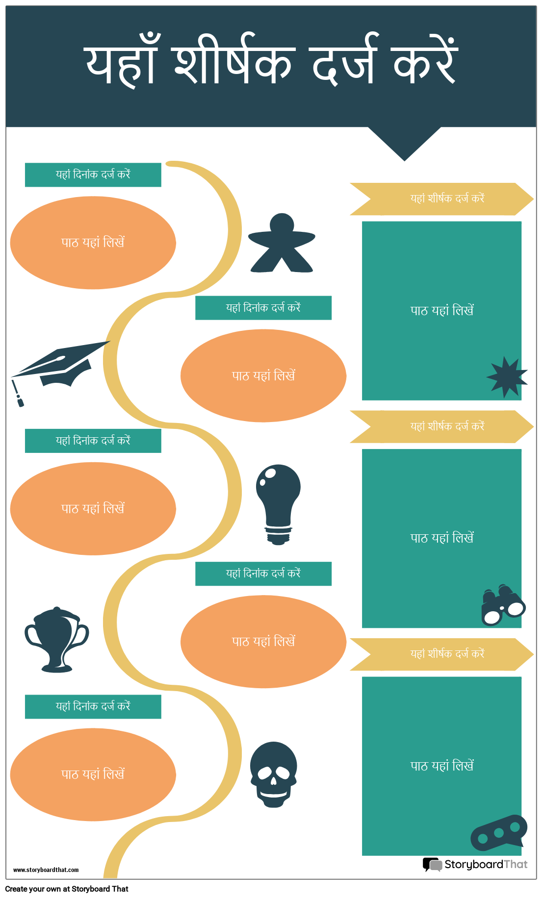 एक रंगीन और सूचनात्मक इतिहास इन्फोग्राफिक बनाएं! अतिरिक्त टेक्स्ट और इमेज के लिए बॉक्स के साथ वर्टिकल वेवी टाइमलाइन।