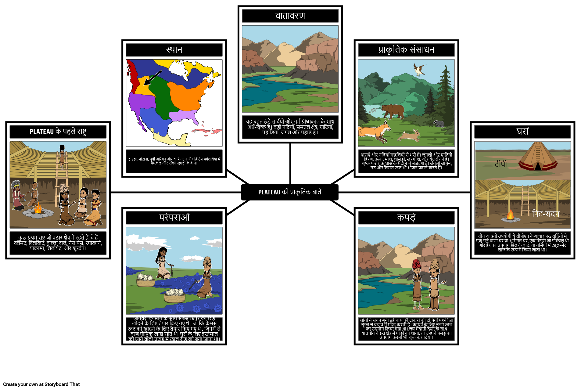 एक मकड़ी का नक्शा बनाएं जो पठारी क्षेत्र के मूल अमेरिकियों के पर्यावरण और संस्कृति का विवरण देता है