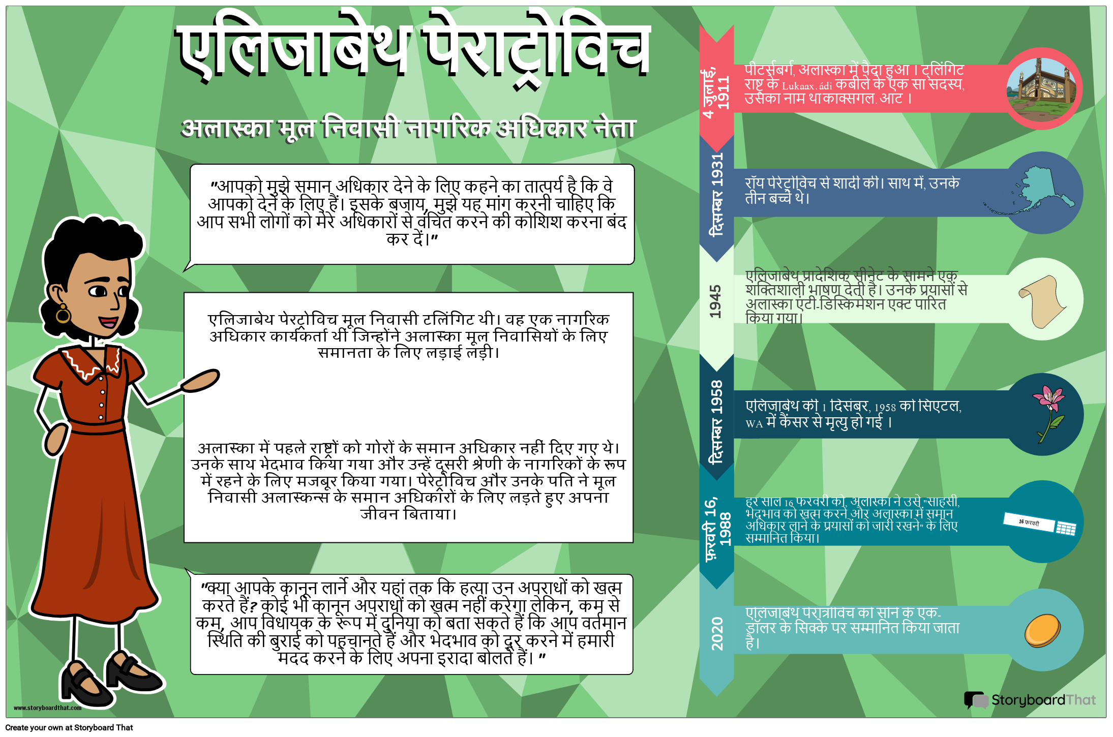 एलिजाबेथ पेरट्रोविच मूल निवासी टलिंगिट थी। वह एक नागरिक अधिकार कार्यकर्ता थीं जिन्होंने अलास्का मूल निवासियों के लिए समानता के लिए लड़ाई लड़ी। अलास्का में पहले राष्ट्रों को गोरों के समान अधिकार नहीं दिए गए थे। उनके साथ भेदभाव किया गया और उन्हें दूसरी श्रेणी के नागरिकों के रूप में रहने के लिए मजबूर किया गया। पेरेट्रोविच और उनके पति ने मूल निवासी अलास्कन्स के समान अधिकारों के लिए लड़ते हुए अपना जीवन बिताया।