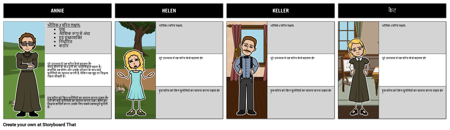 भौतिक / चरित्र लक्षण: युवा आंशिक रूप से अंधा दृढ़ इच्छाशक्ति निर्धारित कठोर पूरे उपन्यास में यह चरित्र कैसे बदलता है? समय बीतने के साथ एनी का आत्मविश्वास बढ़ता है। हालाँकि वह हेलेन और उसके परिवार के साथ कई चुनौतियों का सामना करती है, लेकिन वह खुद पर विश्वास रखना सीखती है। इस चरित्र को किन चुनौतियों का सामना करना पड़ता है? एनी को कई चुनौतियों का सामना करना पड़ा। हेलेन का विश्वास हासिल करना उसके लिए सबसे महत्वपूर्ण चुनौती है।