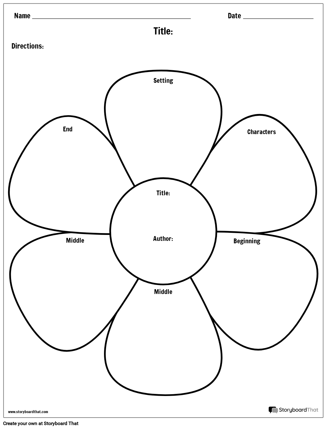 शीर्षक, लेखक, सेटिंग, वर्ण, शुरुआत, मध्य, अंत के लिए संकेतों के साथ फूल के आकार का कहानी नक्शा टेम्पलेट।