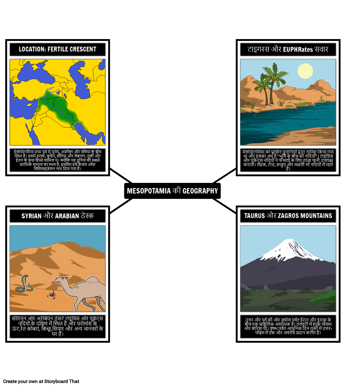 GRAPES: भूगोल, धर्म, उपलब्धियां, राजनीति, अर्थव्यवस्था और सामाजिक जीवन। यह स्टोरीबोर्ड प्राचीन मेसोपोटामिया की भौगोलिक विशेषताओं की व्याख्या करता है।