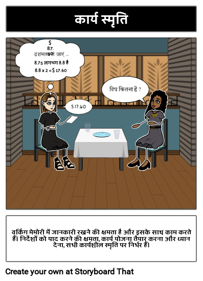 वर्किंग मेमोरी में जानकारी रखने की क्षमता है और इसके साथ काम करते हैं। निर्देशों को याद करने की क्षमता, कार्य योजना तैयार करना और ध्यान देना, सभी कार्यशील स्मृति पर निर्भर हैं।