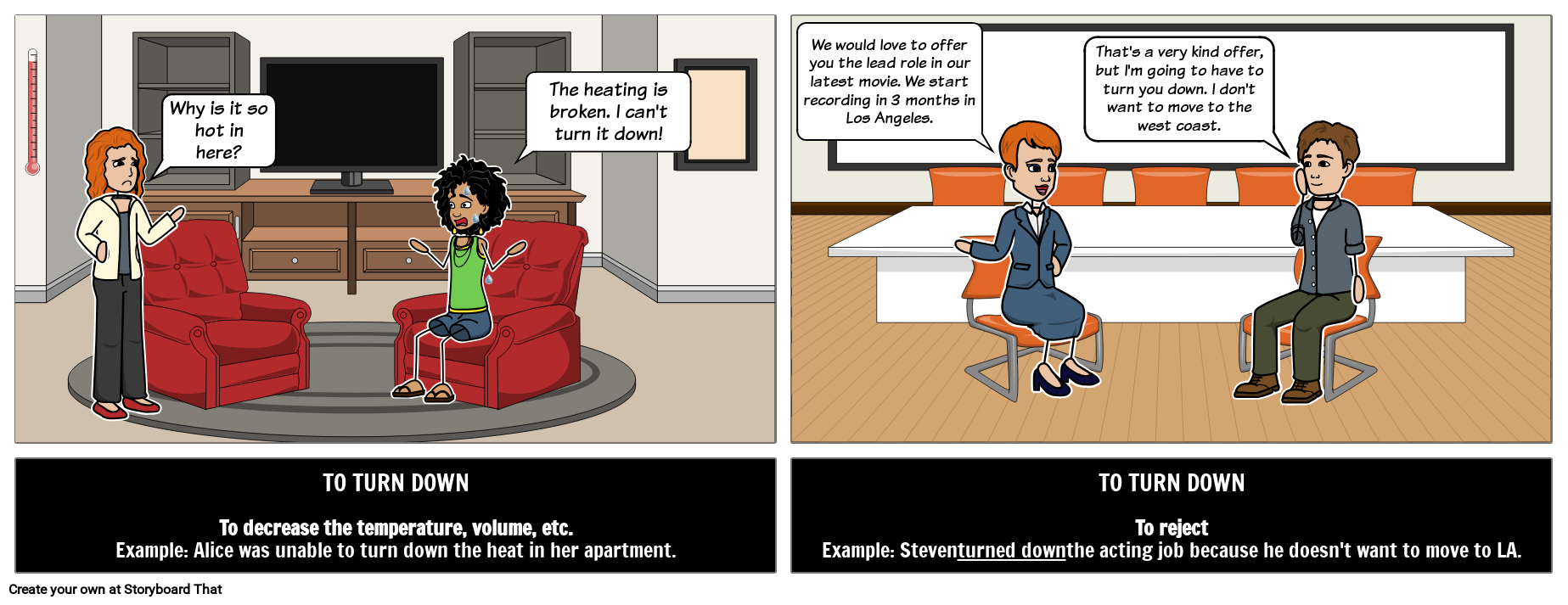 TO TURN DOWNTo rejectExample: Steventurned downthe acting job because he doesn't want to move to LA.