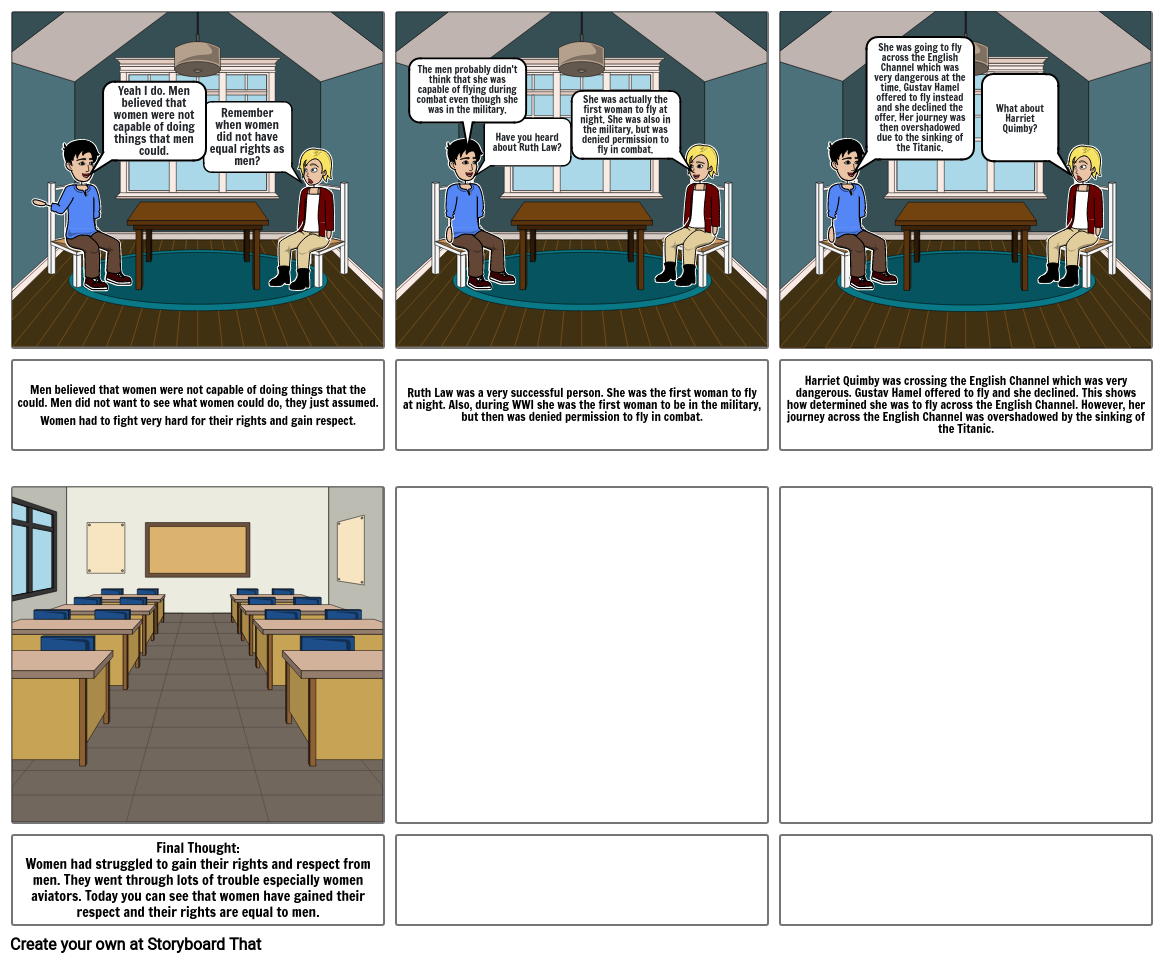 Final Thought:Women had struggled to gain their rights and respect from men. They went through lots of trouble especially women aviators. Today you can see that women have gained their respect and their rights are equal to men.