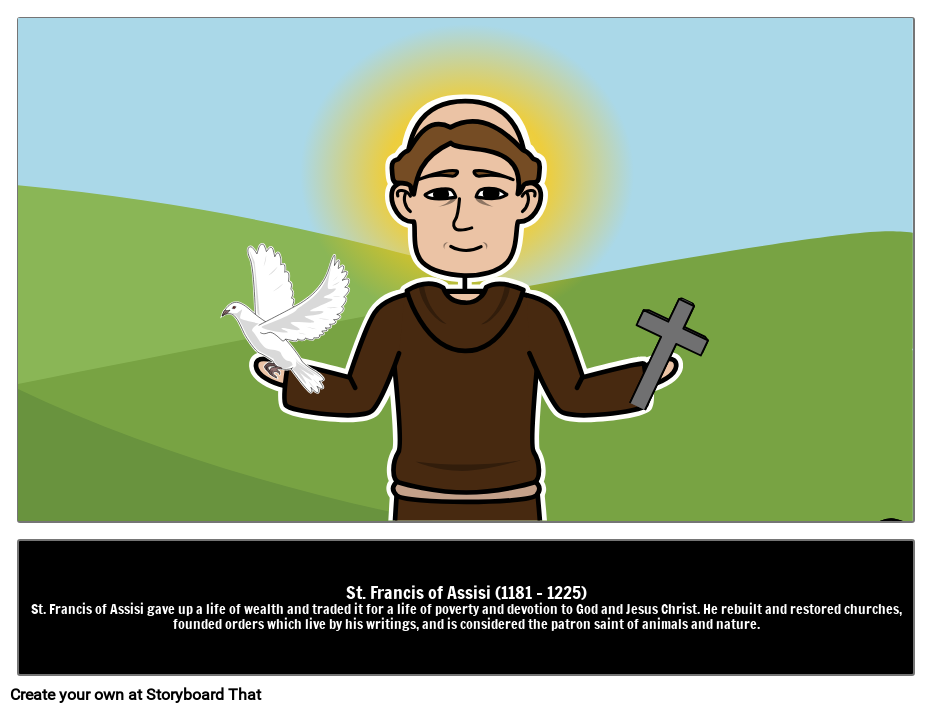 St. Francis of Assisi (1181 - 1225)St. Francis of Assisi gave up a life of wealth and traded it for a life of poverty and devotion to God and Jesus Christ. He rebuilt and restored churches, founded orders which live by his writings, and is considered the patron saint of animals and nature.