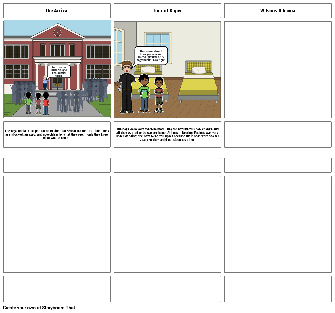 The boys arrive at Kuper Island Residential School for the first time. They are shocked, amazed, and speechless by what they see. If only they knew what was to come...