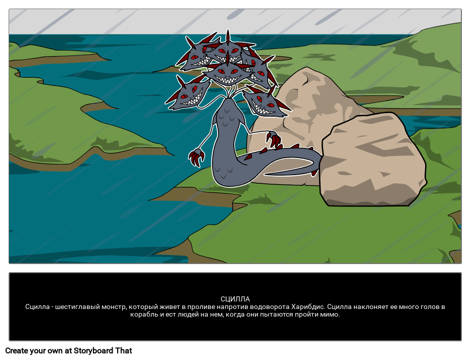 СЦИЛЛАСцилла - шестиглавый монстр, который живет в проливе напротив водоворота Харибдис. Сцилла наклоняет ее много голов в корабль и ест людей на нем, когда они пытаются пройти мимо.