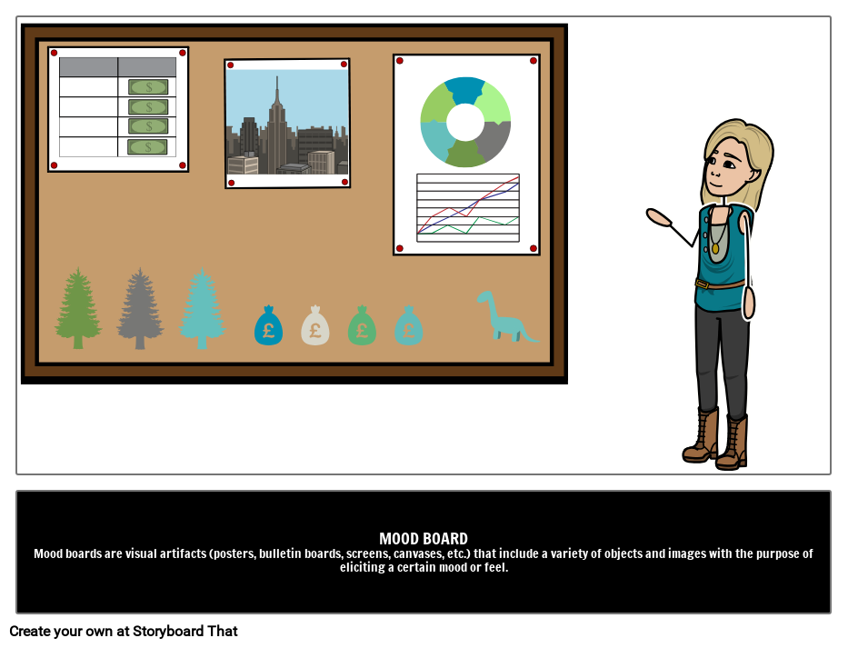 Mood boards are visual artifacts (posters, bulletin boards, screens, canvases, etc.) that include a variety of objects and images with the purpose of eliciting a certain mood or feel