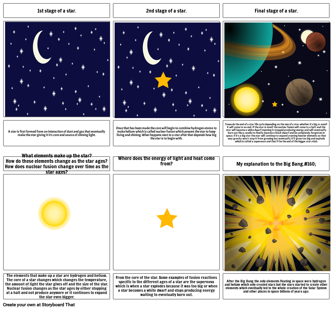 Towards the end of a star life cycle depending on the size of a star whether it's big or small it will come to an end. If the star is small the nuclear fusion will come to a halt and the star will become a white dwarf meaning it stopped producing energy and will eventually burn out like a candle to finally become a black dwarf and be completely forgotten in space. If it's a big star the star will continue to expand creating heavier elements so that way gravity won't stop it from growing but eventually it'll grow too big and explode which is called a supernova and that'll be the end of the bigger star.#160;