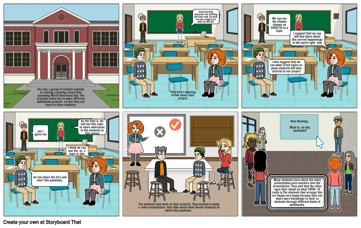 One day, a group of student councils are having a meeting about their upcoming World Awareness Day. The principal asked the to make different multimedia projects so that they can share to other students.