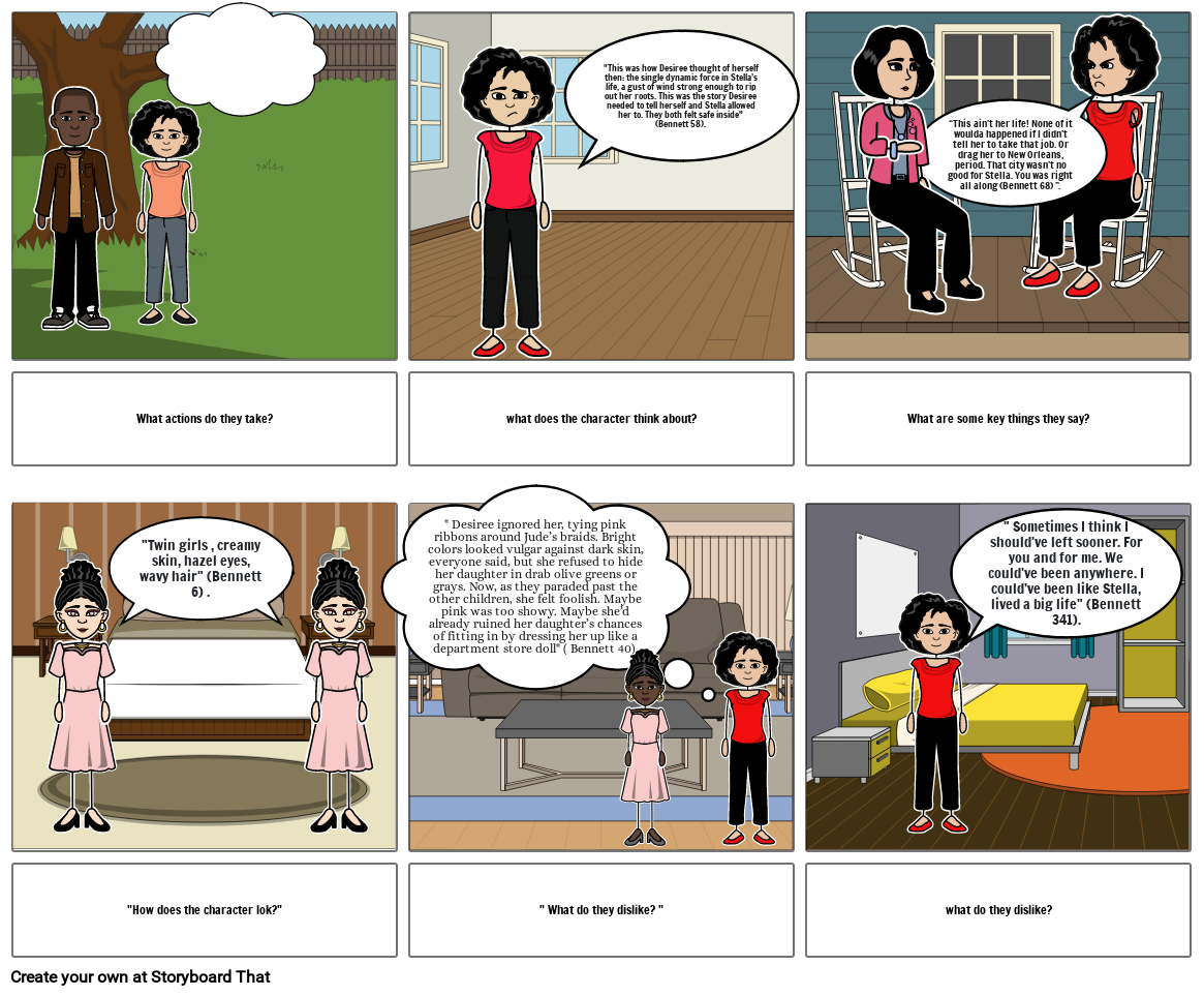 "This was how Desiree thought of herself then: the single dynamic force in Stella’s life, a gust of wind strong enough to rip out her roots. This was the story Desiree needed to tell herself and Stella allowed her to. They both felt safe inside" (Bennett 58).