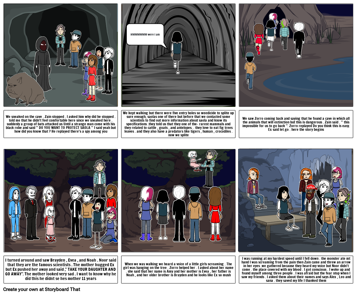 We sneaked on the cave . Zain stopped . I asked him why did he stopped . told me that he didn't feel comfortable here since we sneaked here . suddenly a group of bats attacked us Until a strange man come with his black robe and said '' DO YOU WANT TO PROTECT SAOLA '' I said yeah but how did you know that ? He replayed there's a spy among you