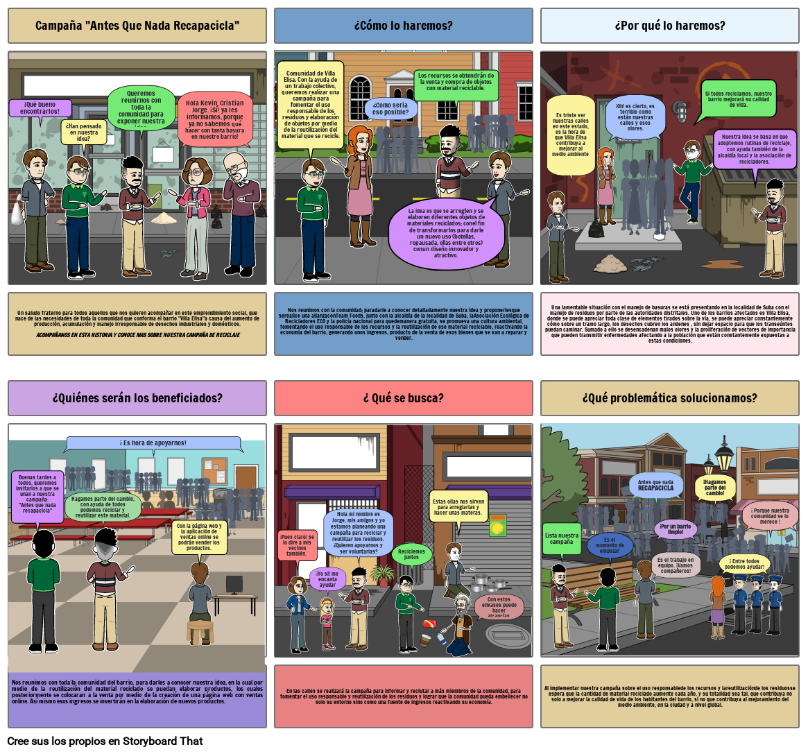 Nos reunimos con toda la comunidad del barrio, para darles a conocer nuestra idea, en la cual por medio de la reutilización del material reciclado se puedan elaborar productos, los cuales posteriormente se colocaran a la venta por medio de la creación de una página web con ventas online. Así mismo esos ingresos se invertirán en la elaboración de nuevos productos.
