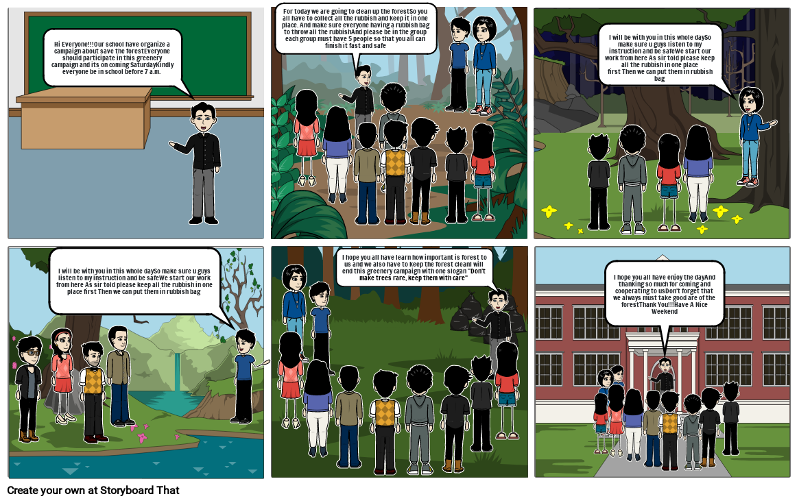 For today we are going to clean up the forestSo you all have to collect all the rubbish and keep it in one place. And make sure everyone having a rubbish bag to throw all the rubbishAnd please be in the group each group must have 5 people so that you all can finish it fast and safe