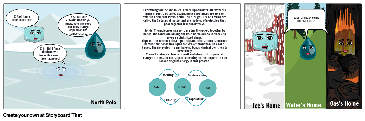 Everything you see and touch is made up of matter. All matter is made of particles called atoms. Most substances are able to exist in 3 different forms: solid, liquid, or gas. These 3 forms are called the 3 states of matter and are made up of molecules that pack together in different ways.Solids: The molecules in a solid are tightly packed together by bonds. The bonds are strong and keep he molecules in place and gives a solid a fixed shape.Liquids: The molecule sin a liquid slip and slide around each other because the bonds in a liquid are weaker than those in a solid.Gases: The molecules in a gas have no bonds which allows them to move freely.These 3 states can freeze or melt and when that happens, it changes states and can happen depending on the temperature ad losses or gains energy in that process.