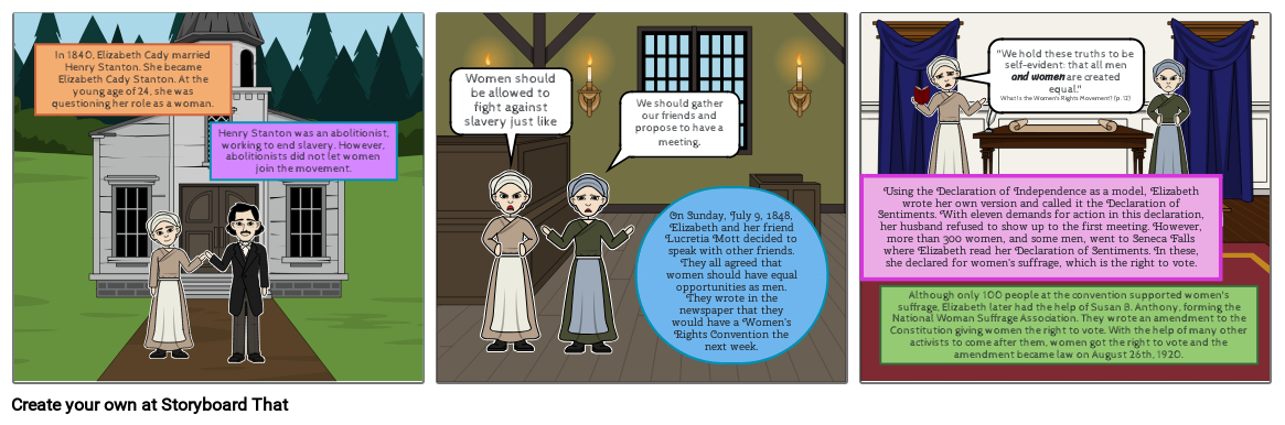 Although only 100 people at the convention supported women's suffrage, Elizabeth later had the help of Susan B. Anthony, forming the National Woman Suffrage Association. They wrote an amendment to the Constitution giving women the right to vote. With the help of many other activists to come after them, women got the right to vote and the amendment became law on August 26th, 1920.