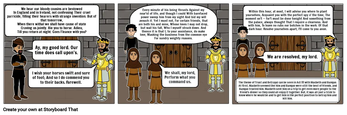 The theme of Trust and Betrayal can be seen in Act ||| with Macbeth and Banquo.At first, Macbeth seemed like him and Banquo were still the best of friends, and Banquo trusted him. Macbeth sent him on a trip to get even more people to the friend's dinner so they could all enjoy it together. But, It was all just a trick to know where he would be and to get him in the perfect position to betray him and kill him.