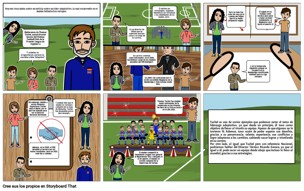 Tuchel es uno de varios ejemplos que podemos notar el tema de liderazgo adaptativo, ya que desde un principio, él tuvo como objetivo de llevar al triunfo su equipo. Apesar de que algunos no le tuvieron fé. Ademas, tuvo razón de poder superar sus desafios, gracias a su perservancia, talento, experiencia, sus conflictos y logro adaptarse a los cambios, sabiendo sacar logros y triunfando en su carrera.Por otro lado, al igual que Tuchel pero con referencia Nacional, podriamos hablar del Director Técnico Ricardo Gareca, ya que al igual a él, pudo sacar un equipo desde abajo que incluso lo llevo al mundial, gracias a sus estrategias.