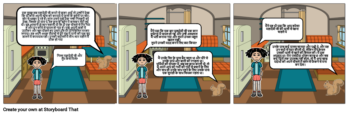 एक सुबह जब महादेवी जी कमरे से बाहर आईं तो उन्होंने देखा कि दो कौवे अपनी चोंच को बरामदे में फूलों के बर्तनों पर जोर-जोर से धक्का दे रहे हैं। तुरंत उसने मुझे एक नन्ही गिलहरी को देखा, जिसके दो घाव थे, वह फूल के बर्तन में कसकर लेटी हुई थी। वह आसानी से जान सकती थी कि मैं एक घोंसले से गिर गया हूँ और इन कौवे से घायल हो गया हूँ। मुझे अपनी बाहों में उठाकर और खून पोंछते हुए उसने उस पर पेनिसिलिन मरहम लगाया। वह अपने अथक प्रयासों से मेरे मुंह में पानी की एक बूंद डालने में कामयाब रही। उनकी बदौलत मैं तीन-चार महीने में ठीक हो गया
