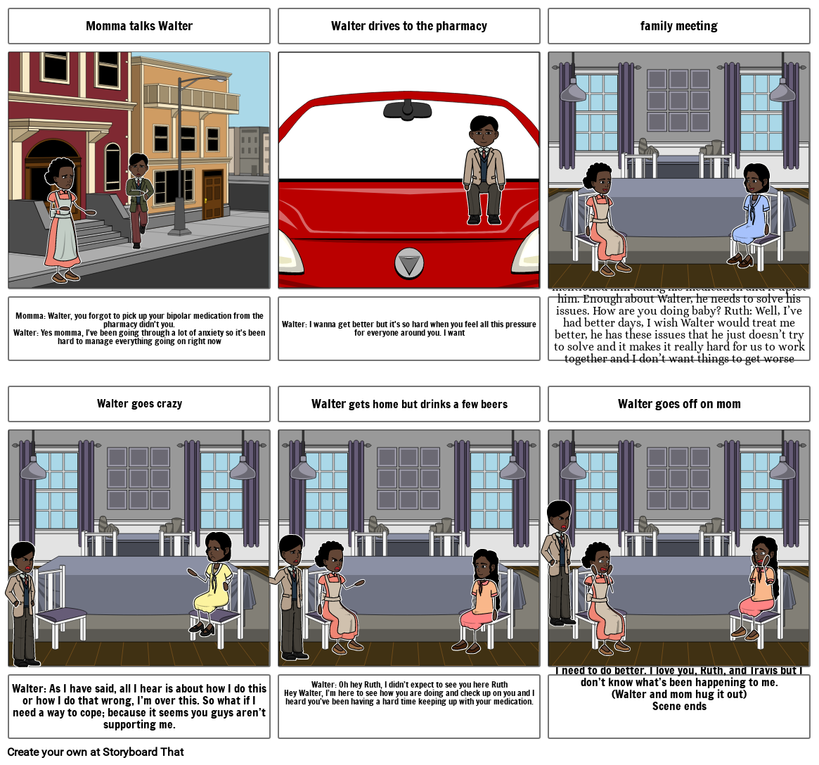 Momma: It’s just Walter being Walter. I mentioned him taking his medication and it upset him. Enough about Walter, he needs to solve his issues. How are you doing baby? Ruth: Well, I’ve had better days, I wish Walter would treat me better, he has these issues that he just doesn’t try to solve and it makes it really hard for us to work together and I don’t want things to get worse