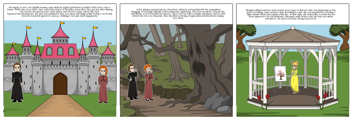 On August 10 1901, two English women, Anne Moberly (right) and Eleanor Jourdain  (left) took a trip to  France. While they were there, they visited the Palace of Versailles. Soon after, they got lost after missing the turn for the main avenue of the palace and entered a lane, where they had bypassed their destination. The pair was confused as they saw many odd things whilst trying to seek help from the locals but ignored it anyway, thinking it was just their imagination.