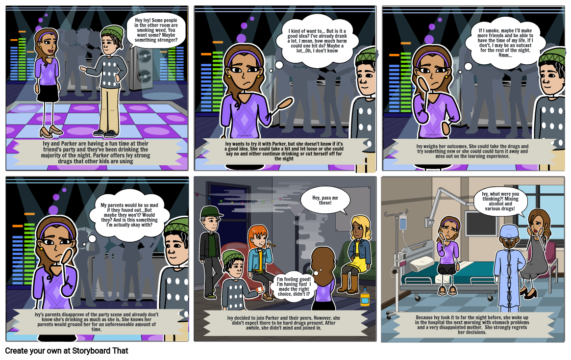 Ivy weighs her outcomes. She could take the drugs and try something new or she could could turn it away and miss out on the learning experience.