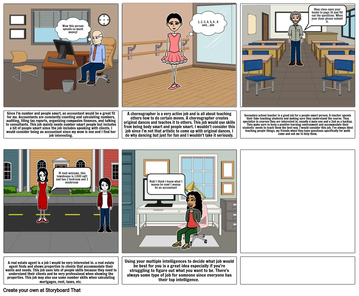 Since I'm number and people smart, an accountant would be a great fit for me. Accountants are constantly counting and calculating numbers, auditing, filing tax reports, organizing companies finances, and talking to consultants. This job mainly needs number smart people but includes a bit of people smart since the job includes speaking with clients. I would consider being an accountant since my mom is one and I find her job interesting.