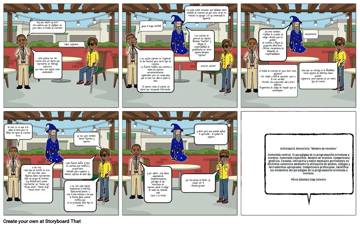 Actividad 8. Historieta Modelo de eventos Contenido central: El paradigma de la programación orientada a eventos. Contenido específico: Modelo de eventos. Competencia genérica: Escucha, interpreta y emite mensajes pertinentes en distintos contextos mediante la utilización de medios, códigos y herramientas apropiados. Competencia profesional: Identifica los elementos del paradigma de la programación orientada a eventos.Pérez Sánchez Enya Celeste