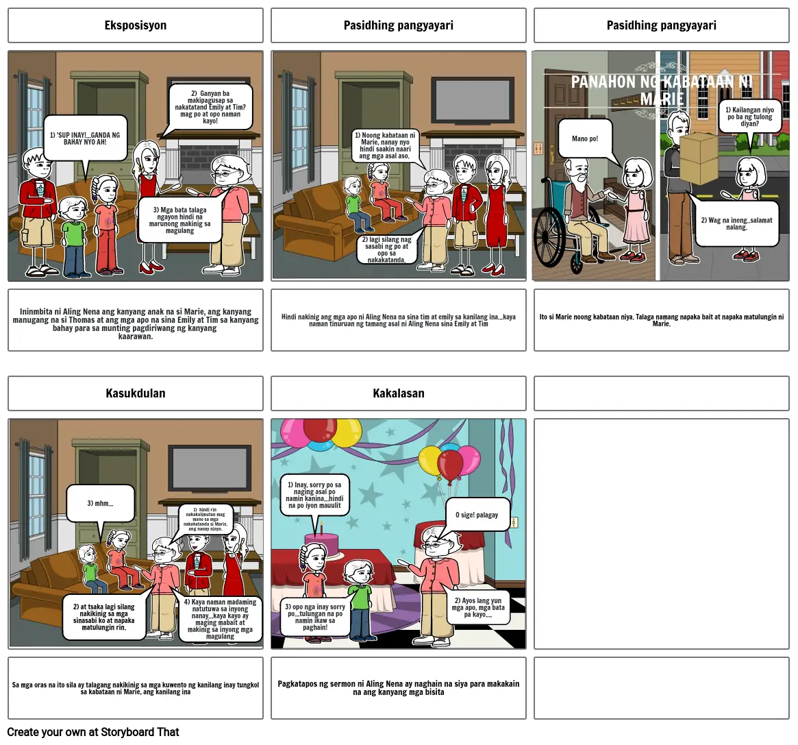 Ininmbita ni Aling Nena ang kanyang anak na si Marie, ang kanyang manugang na si Thomas at ang mga apo na sina Emily at Tim sa kanyang bahay para sa munting pagdiriwang ng kanyang kaarawan.