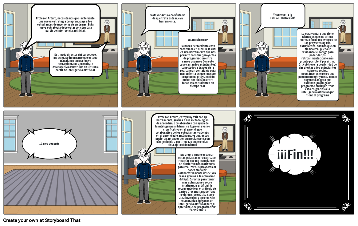 Me alegra mucho escuchar estas palabras director. Cabe resaltar que los estudiantes se sintieron más motivados para realizar sus proyectos al poder trabajar colaborativamente desde sus casas gracias a la aplicación GitHub. Director para tener más aplicaciones sobre inteligencia artificial le recomiendo leer el articulo de Carlos Giovany llamado Una revisión sistemática sobre aula invertida y aprendizaje colaborativo apoyados en inteligencia artificial para el aprendizaje de programación(Carlos 2021)