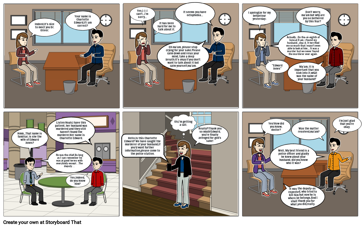 One day, A psychiatrist named Doctor Oliver had a patient named "Charlotte Jones". She had Octophobia and was traumatised by the number 8. It was a very rare case for Doctor Oliver and when he tried talking to her about the problem, she couldn't,she started sobbing and the doctor tried to calm her down and comforted her that it was okay.The next day, she tried to apologize but the doctor reassured her that there was nothing to worry about and asked her to tell her about her phobia.And finally, she spoke up and said that her husband died at the 8th of June, at 8 am and she was terrified by the body. It was an assassination but they never found the murderer.The doctor advised her to look into the case .He then asked his best friend (who was a police officer) to look into the matter and Doctor Oliver learnt a few things about Charlotte's husband,Edward Jones.The next morning, when Charlotte was leaving for work, she received a call telling her that her husband's murderer was caught and she could come to the police station for further information.In her next session with the doctor, the doctor asked her about the matter and she was wondering how he knew , so he told her about his friend and Charlotte thanked him and she finally conquered her fear.