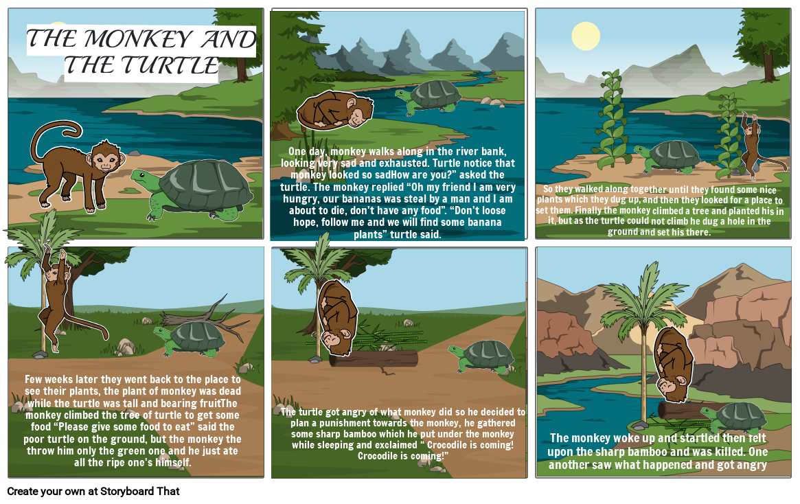 One day, monkey walks along in the river bank, looking very sad and exhausted. Turtle notice that monkey looked so sadHow are you?” asked the turtle. The monkey replied “Oh my friend I am very hungry, our bananas was steal by a man and I am about to die, don't have any food”. “Don't loose hope, follow me and we will find some banana plants” turtle said.