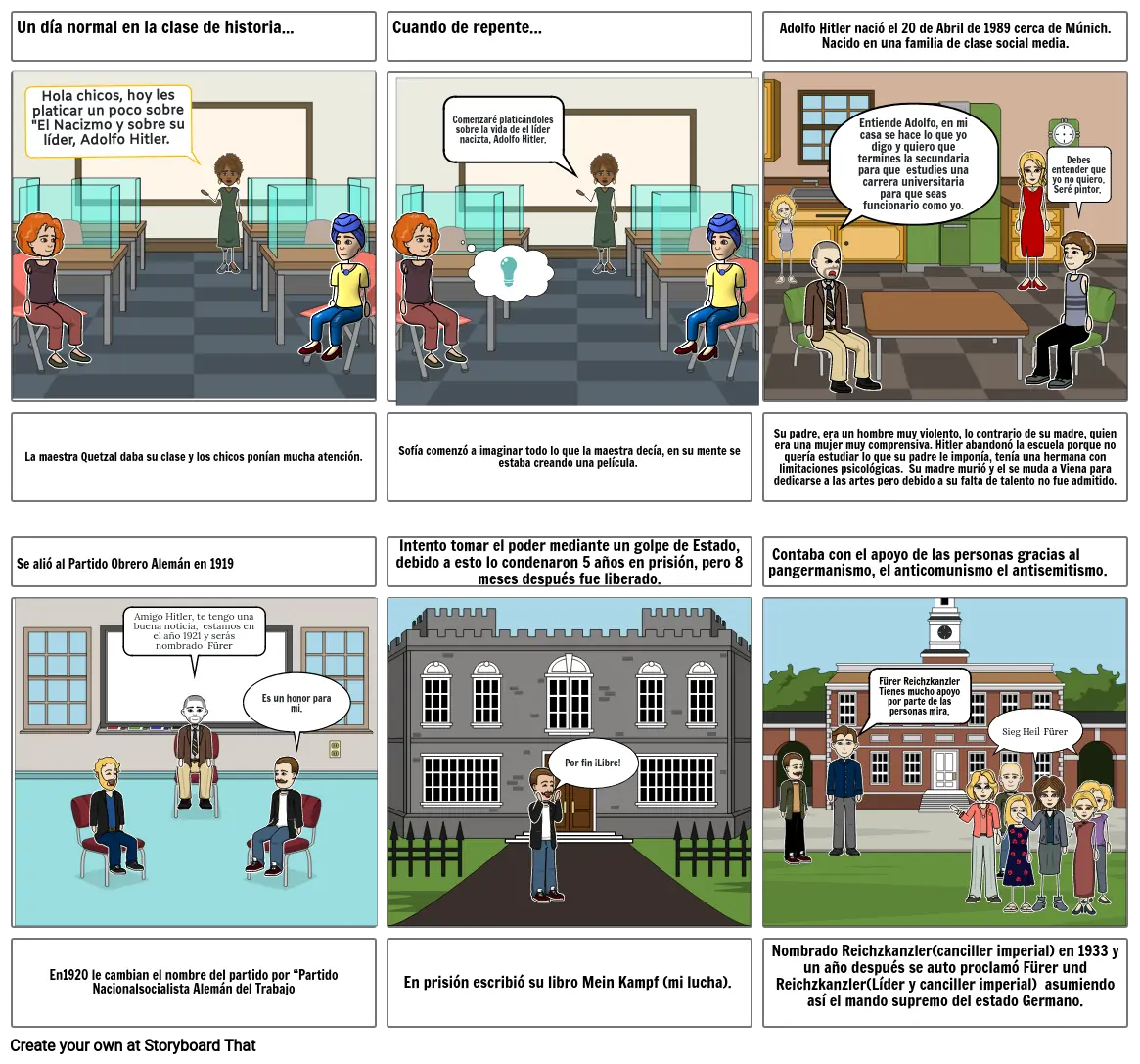 Su padre, era un hombre muy violento, lo contrario de su madre, quien era una mujer muy comprensiva. Hitler abandonó la escuela porque no quería estudiar lo que su padre le imponía, tenía una hermana con limitaciones psicológicas. Su madre murió y el se muda a Viena para dedicarse a las artes pero debido a su falta de talento no fue admitido.