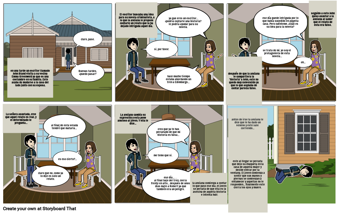 El escritor buscaba una idea para su novela criminalista, a lo que la anciana le propone contarle un relato que la ha dejado intrigada aquel día.